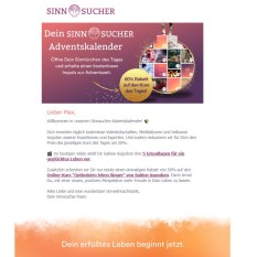 Bis zum 24. Dezember schenken wir Dir täglich 50% Preisnachlass auf den jeweiligen Sinnsucherkurs des Tages sowie einen gratis Videoimpuls für mehr innere Ruhe und Gelassenheit.